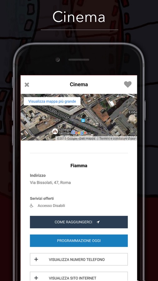 * Potrete navigare nel sito del cinema o visualizzare la mappa senza uscire dall’applicazione;