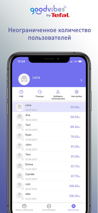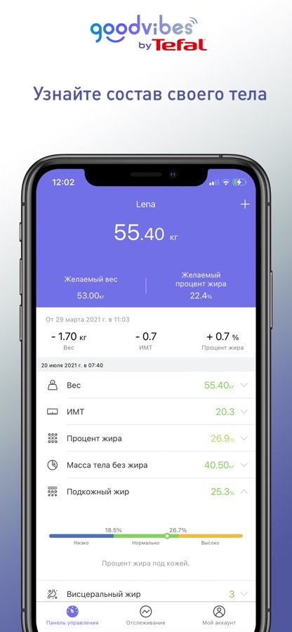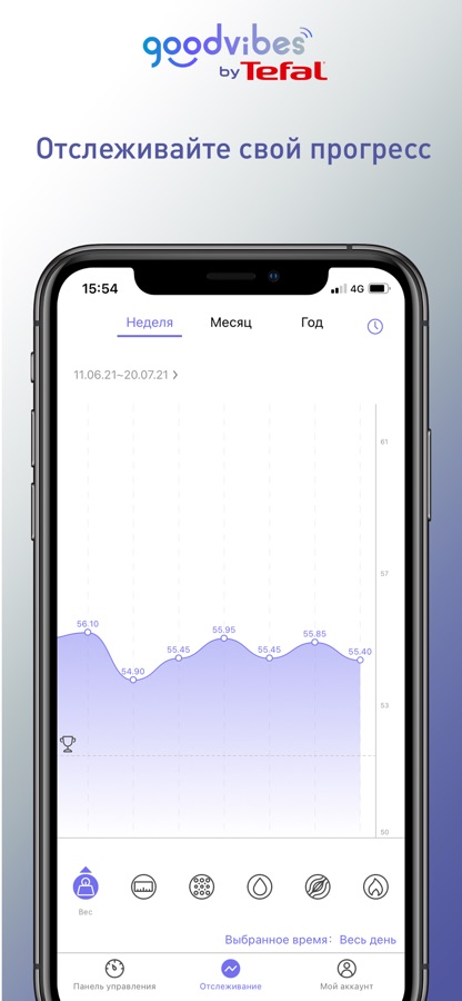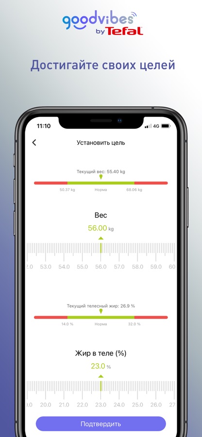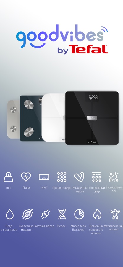 Приложение Goodvibes Connect работает с подключенными весами Goodvibes от Tefal и Rowenta. Это ультраинтуитивное приложение позволяет мгновенно увидеть состав вашего тела, отслеживать прогресс и оставаться мотивированным благодаря положительной энергии!