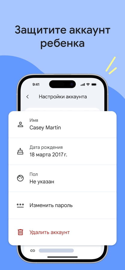 • Защитите аккаунт ребенка. С помощью Family Link можно управлять настройками аккаунта и доступа к данным ребенка — изменить или сбросить пароль, редактировать личную информацию или удалить аккаунт, если понадобится.*
