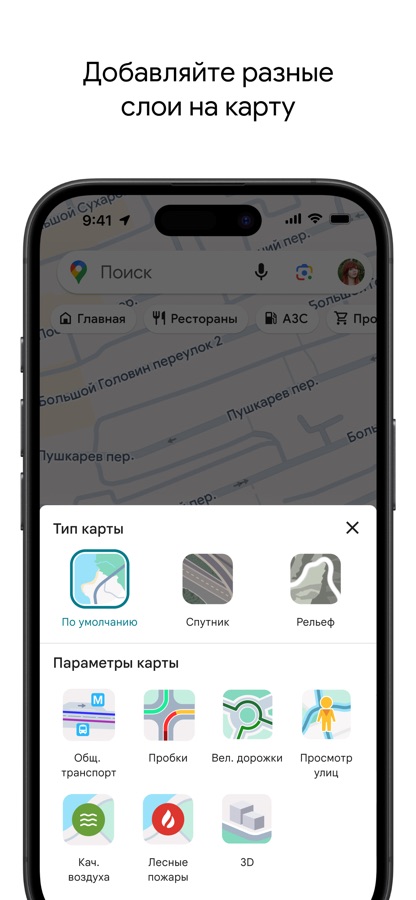 В Google Карты можно проложить маршрут на чём угодно. Для автомобилистов доступны голосовые подсказки о поворотах, камерах и полосах движения, а маршруты перестраиваются в реальном времени, чтобы объезжать пробки. Велосипедисты получат треки с учётом велодорожек и рельефа. Пешеходам помогут маршруты через парки, пешеходные зоны и даже внутренние дворы. А для пользователей общественного транспорта приложение показывает расписание автобусов, поездов и электричек, а также прогноз прибытия на остановку. На iPhone можно отслеживать движение транспорта в реальном времени и получать уведомления о задержках.