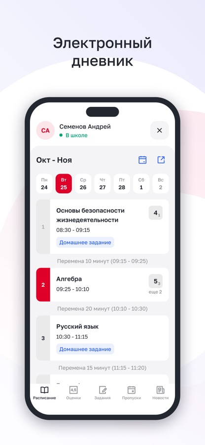 — Сервис «Электронный дневник» объединяет важную информацию об учебе: расписание уроков, домашние задания, оценки, внеурочные занятия и многое другое;