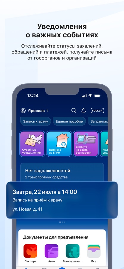 В приложении можно оплачивать штрафы и госпошлины, подавать заявления в ведомства, хранить личные документы и предъявлять их в бытовых ситуациях, сканировать товары, управлять согласиями на использование личных и биометрических данных и многое другое