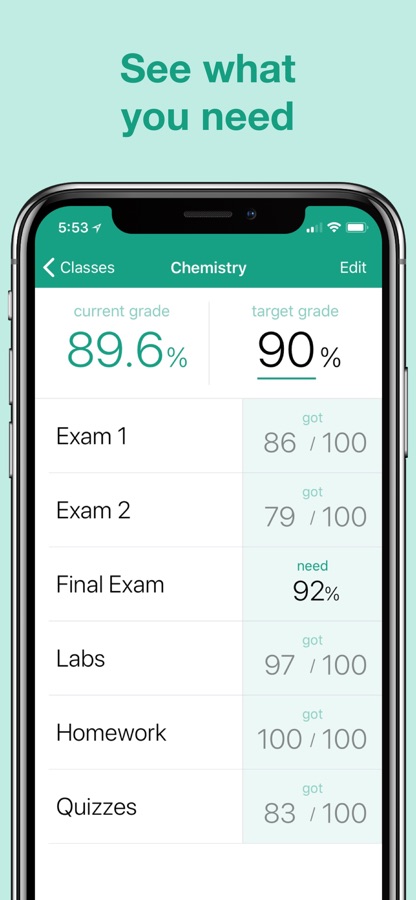 Grades shows what you need on your next test to hit your target grades and GPA.