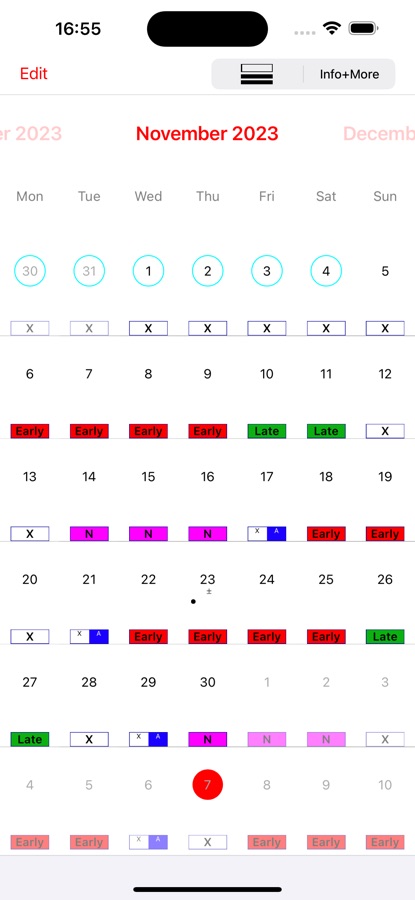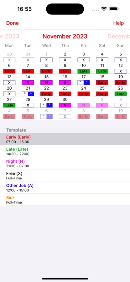 Теперь Вы можете быстро и легко вносить в календарь Ваши смены/дежурства! Создайте образец для Ваших смен, утренней, вечерней и т.д., выберете одну из них и нажмите на соответствующий день. Таким образом за несколько минут Вы введете Ваши смены/дежурства на месяц. Быстрее и быть не может!