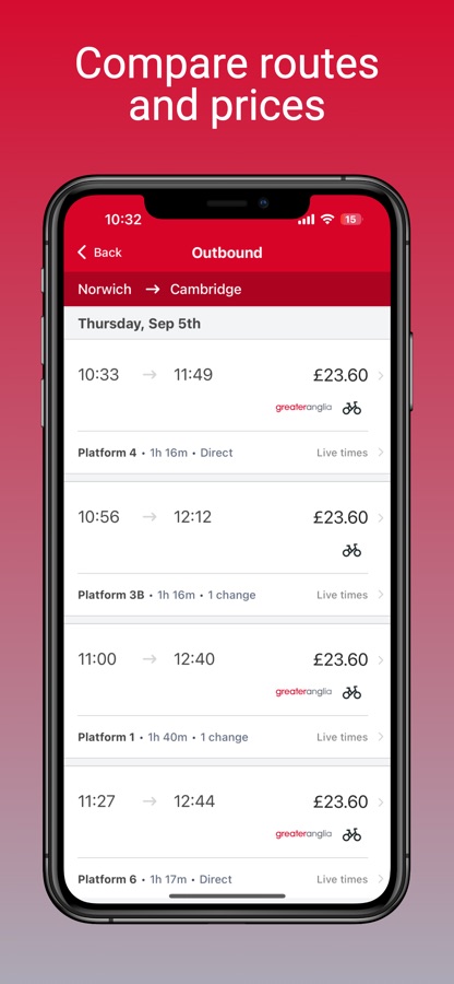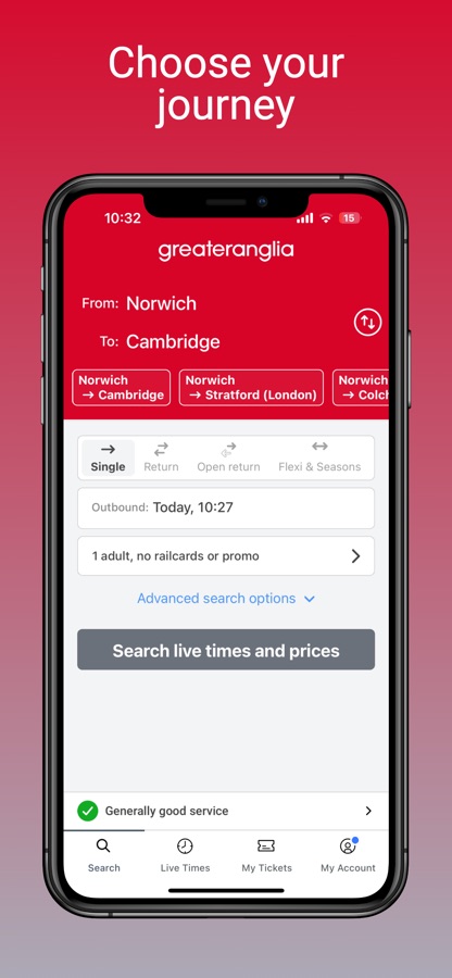 The Greater Anglia app is like a ticket machine in your pocket. It’s easy to use so you can save time and avoid queues at the station. Plus, the cheapest ticket is highlighted & we don’t charge any booking or payment card fees!
