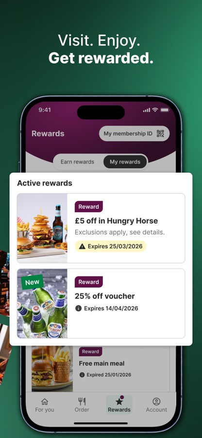 Register and activate rewards in the app to unlock exclusive offers, discounts, and occasional freebies, whether you’re grabbing a pint with friends or enjoying a full meal. Your rewards are stored in the app, making it easy to view and redeem them whenever you like. Access your Membership ID QR code via the app, and download it to your Apple Wallet for quick scanning when paying at the bar.