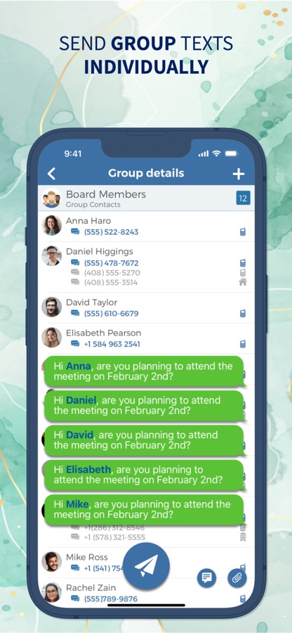 Group Text – это легкое, удобное в использовании, экономящее время и хорошо продуманное приложение, которое дает возможность отправлять текстовые сообщения группе контактов за одно действие, легко создавать и изменять группы, производить быстрый поиск групп и контактов, выбирать многочисленные номера для контакта, использовать функцию шаблона для мгновенной отправки повторяющихся текстовых сообщений группам.