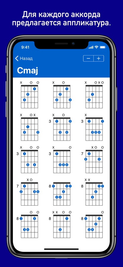 • Просматривайте все возможные вариации аккордов, обращения и позиции на грифе.
