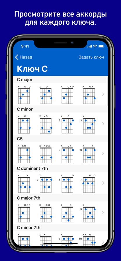• Изучайте аккорды во всех тональностях: мажорные, минорные, уменьшенные, увеличенные, сус, расширенные и другие.