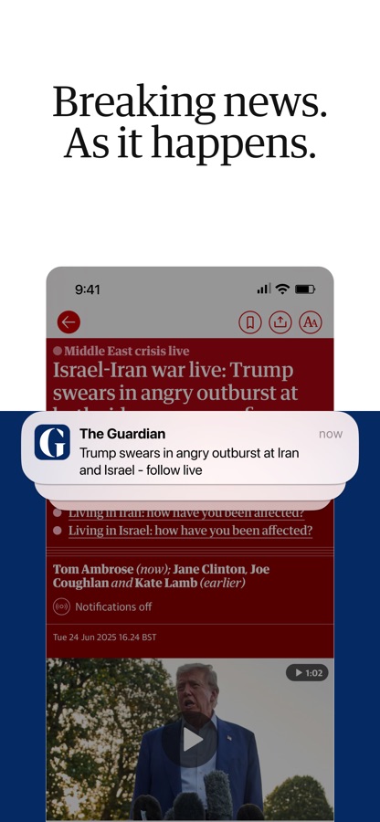 Get fearless, independent journalism with the Guardian app. Never miss breaking news, dive into diverse opinion pieces, and follow stories minute-by-minute with our dynamic live blogs — from world news and politics to business and sport. Get the following app exclusive features: