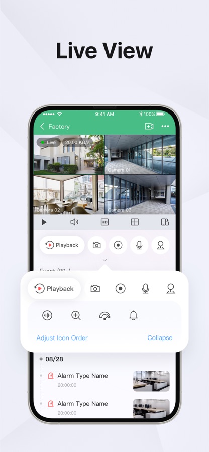 The Guarding Vision app is designed to work with DVRs, NVRs and IP cameras which support Cloud P2P function. It allows you to live view your cameras remotely. All you need to do is creating an account and adding device into the account, then you can enjoy the real-time video from cameras on a global scale. It also allows you to play back recorded video to search every milestone of your life. When motion detection alarm of your device triggered, you can get an instant message notification from Guarding Vision app.