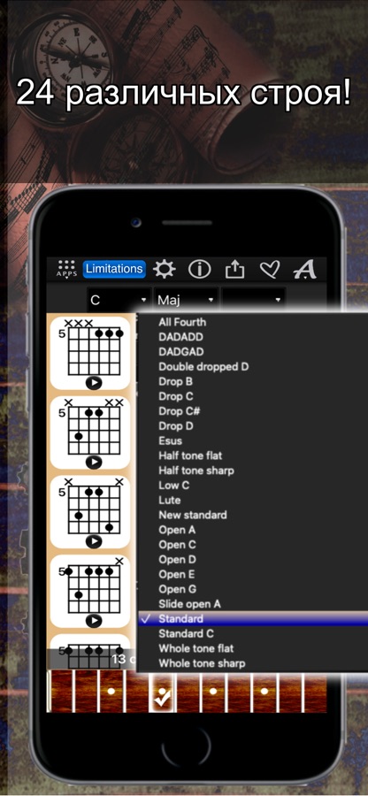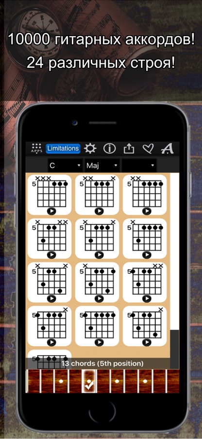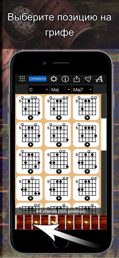 + Доступ к 10 000 диаграммам аккордов на 11 позициях грифа гитары