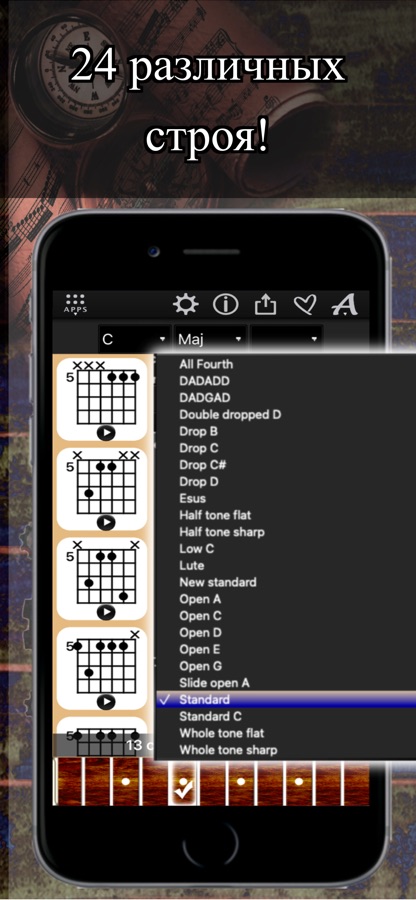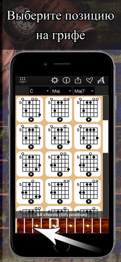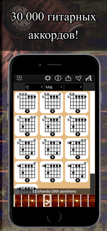 + Доступ к более чем 30,000 диаграммам аккордов во всех 17 позициях грифа гитары