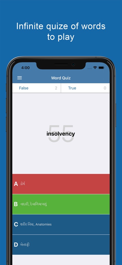 — We developed a new quiz inside Gujarati dictionary! To take the quiz, you can easily tap the option icon in the top left side of the screen and choose quiz. Now, you will see a word in the screen with 4 answers, you will have to tap the answer that you think its right to see if it’s the good choice or not. Keep in mind, that there is a countdown timer and if it finishes without a reply from you, then the quiz will ends.