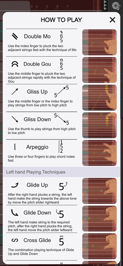 — Playing techniques for Right Hand: Pluck, Gliss, Tremolo(Shake/摇指) / Automatic Tremolo, Overtone.