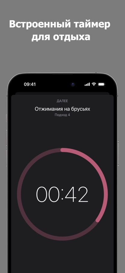 • Таймер отдыха, который работает в фоновом режиме и оповестит о начале следующего подхода