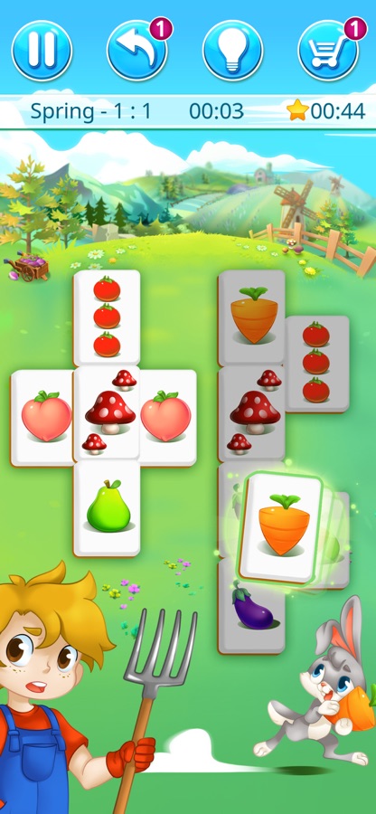 В этой прекрасной игре вам нужно собрать фрукты и овощи из своего овощного сада. Легко их выбрать, просто найдите 2 пары идентичных плиток и нажмите на них. Это как игра в Маджонг, но это еще веселее с миром сельской местности и фермы.