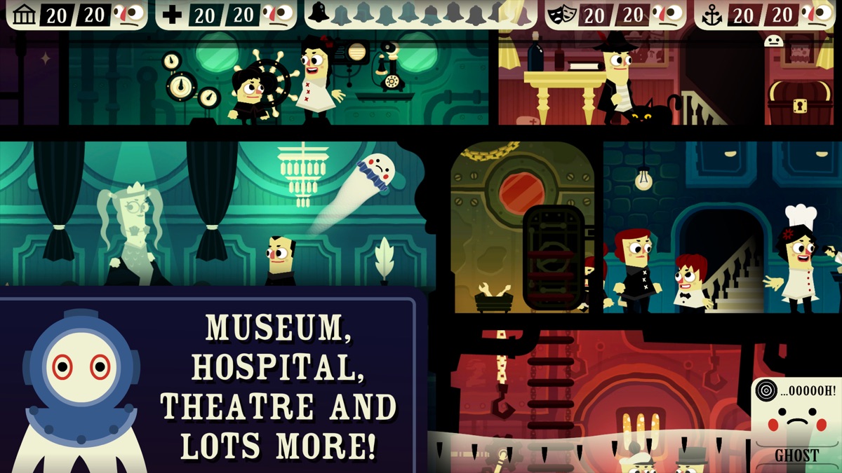 Leave the dusty halls of an abandoned clock tower to haunt your way through a town in the dead of night! Possess objects with your ghostly soul, to scare people away from a museum, a hospital, a theatre and a cruise ship. Will you be able to scare everyone out and reclaim what has been lost, before the night is over?