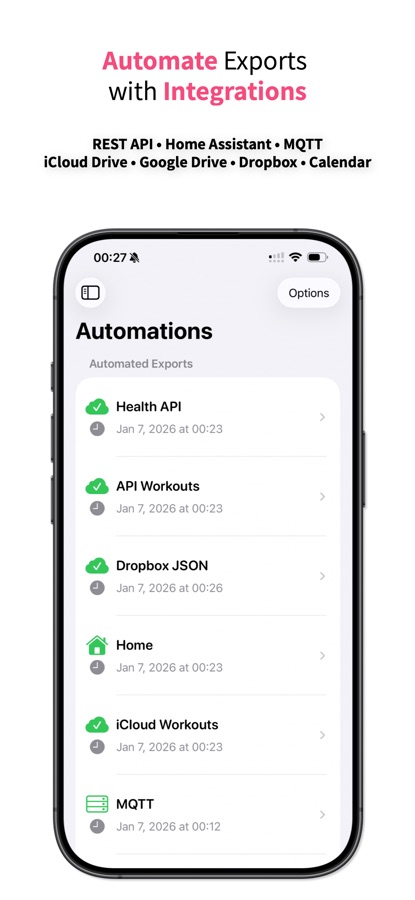 Export 150+ health and fitness metrics from iPhone in CSV, JSON, or GPX format. Perfect for data backup, personal insights, or analysis with generative AI tools. Query data directly over the network, or automate exporting with iCloud Drive, Google Drive, Dropbox, REST APIs, Home Assistant, MQTT, and iOS Calendar. Sync to Mac or create your own dashboards.