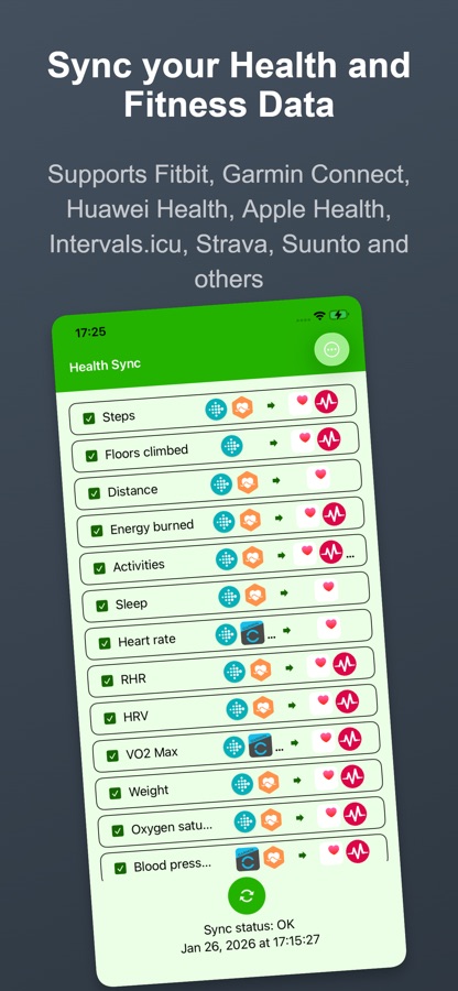 Health Sync synchronizes data between health and fitness apps. Health Sync currently supports syncing from Apple Health, Coros, Fitbit, Garmin Connect, Huawei Health, Oura, Polar Flow, Strava and Suunto to Apple Health, Coros, Fitbit, Intervals.icu, Runalyze, Selfloops, Strava, Suunto and TrainItAll. Additional source and destination apps will be added with future updates.