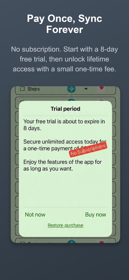 Health Sync is very easy to use. It offers a one-week free trial period. After the trial period, you can make a one-time purchase (lifetime license) to continue using the app and access the historical data sync option.