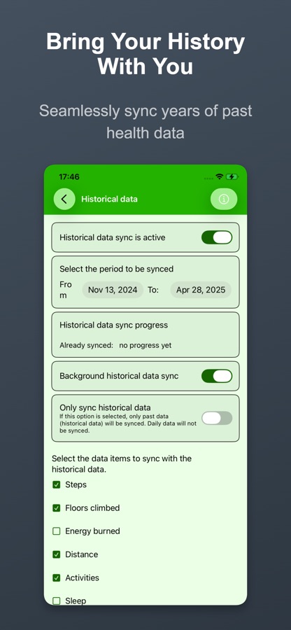 Health Sync uses a privacy-by-design approach. The sync processes data on your phone, not on cloud servers. Your data won’t be used and can’t be accessed by others. Read the privacy policy for details.