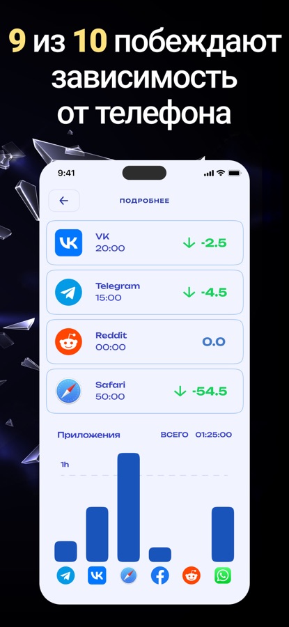 ⌘ 9 из 10 пользователей отметили улучшение качества сна без ночного скроллинга.