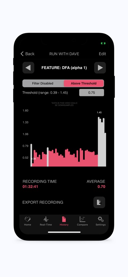 Heart Rate Variability Logger lets you record, plot and export time, frequency and non-linear HRV Features (includes experience sampling, RR-interval correction, DFA alpha 1 for aerobic threshold estimation in real-time, comparison between recordings, activity monitoring & step counting, location tracking).