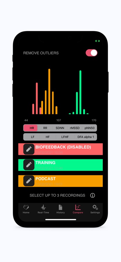 — Comparison between up to 3 recordings lets you get a better understanding of differences in HRV under different contexts in a glance. The comparison modality includes also Outlier removal