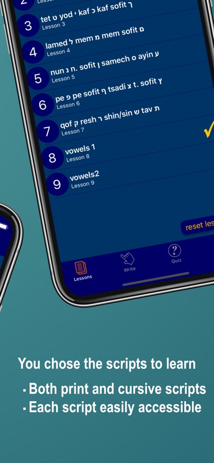 Study the letters in each lesson and write them down several times. Use the Write tab to learn to write letters in both the cursive and print scripts.