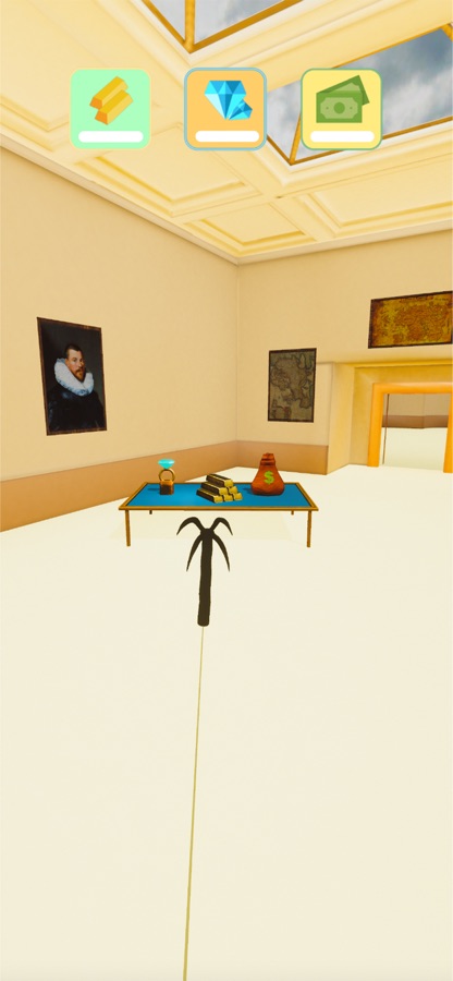 The treasures are on the tables and locked boxes. You have to hook on them and get back them.