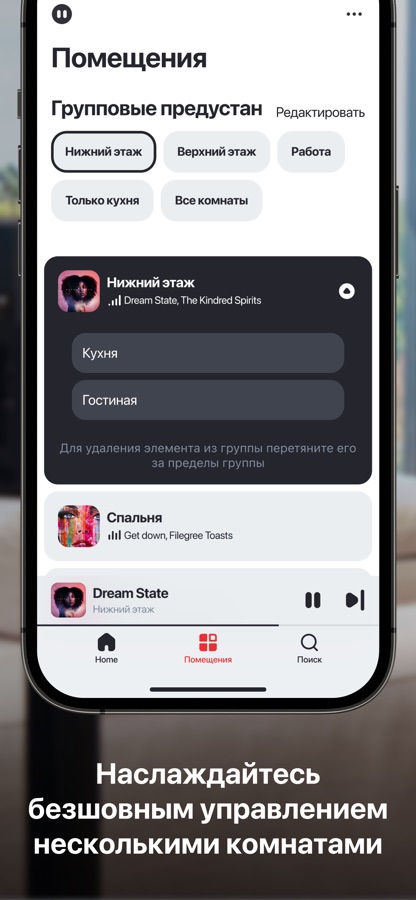 Настоящий звук в нескольких комнатах: воспроизводите разные композиции в разных комнатах или одну и ту же композицию в нескольких комнатах.