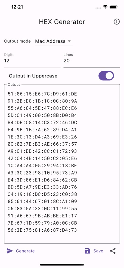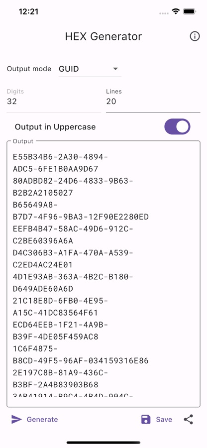 Simple HEX string generator with ability to generate HEX string in Custom as well as in GUID and Mac Address formats.
