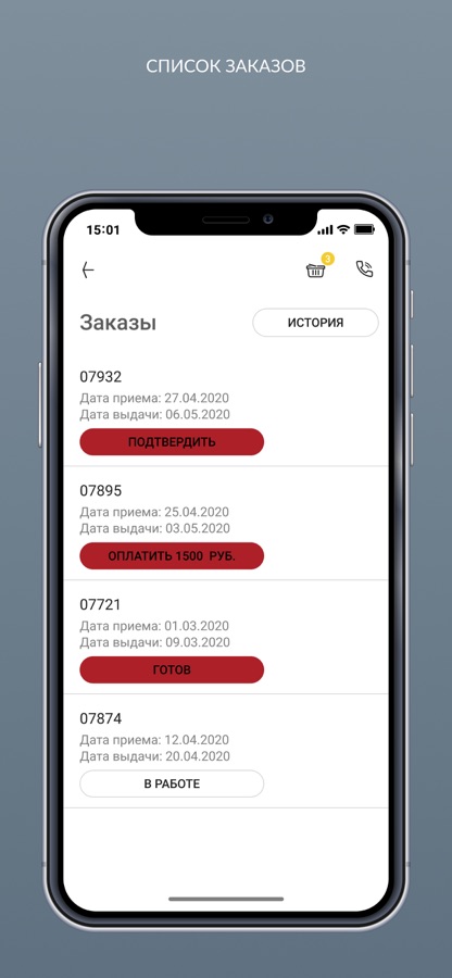 — посмотреть свои заказы в работе, их статусы, историю заказов;