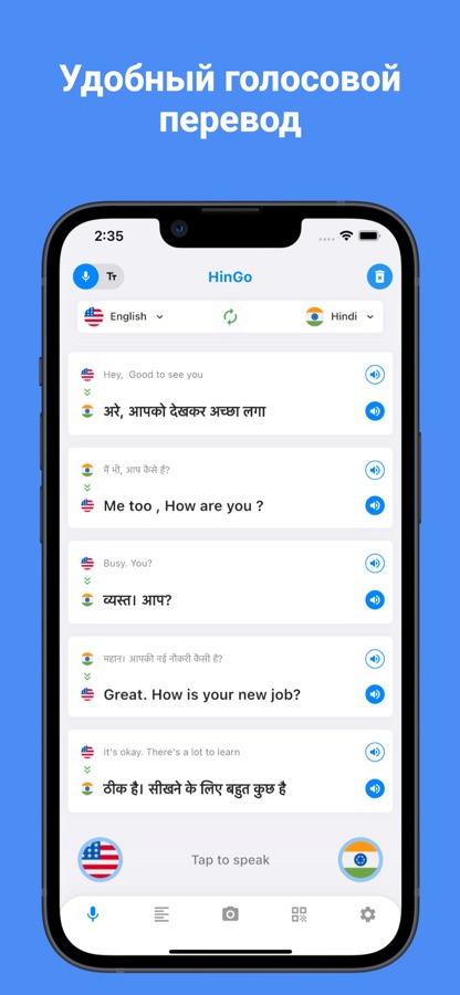 HinGo — ведущее приложение-переводчик хинди со множеством выдающихся функций, таких как точный голосовой, текстовый и фотоперевод с хинди на 45 языков и наоборот.
