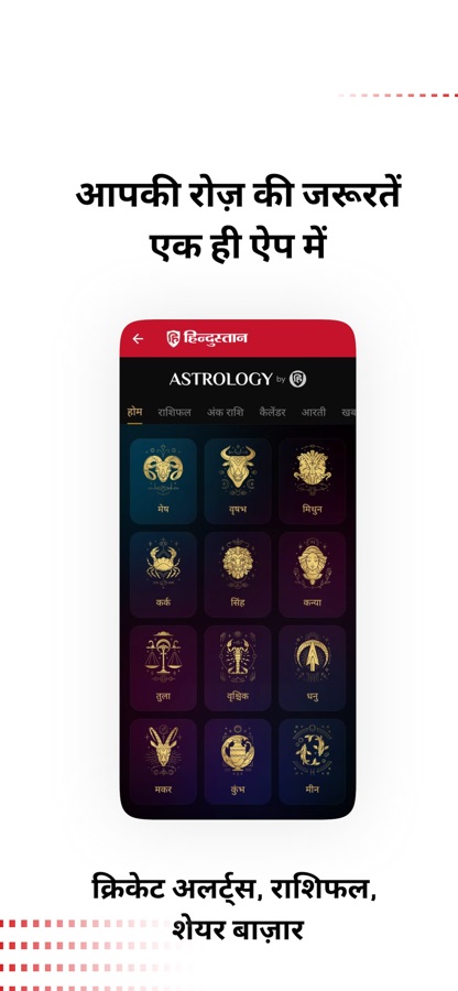 • Daily Horoscope in Hindi: Read your daily (आज का राशिफल), weekly (साप्ताहिक राशिफल), monthly (मासिक राशिफल) & yearly Horoscopes (वार्षिक राशिफल) in Hindi. Also, learn everything about Astrology, Numerology and Astro