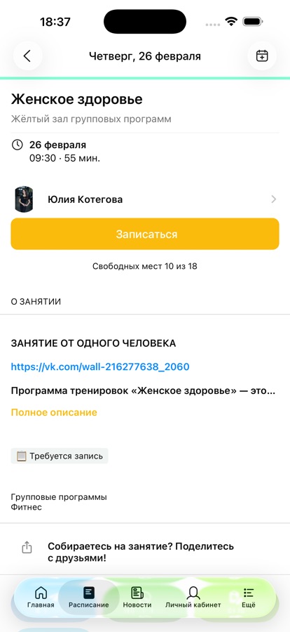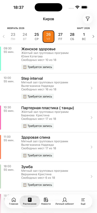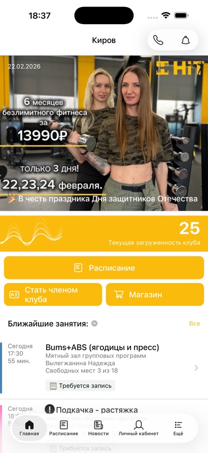 С помощью приложения вы можете следить за новостями, расписанием клуба, оперативно получать информацию об изменениях в расписании и специальных предложениях.