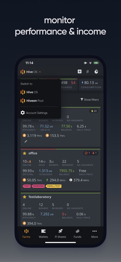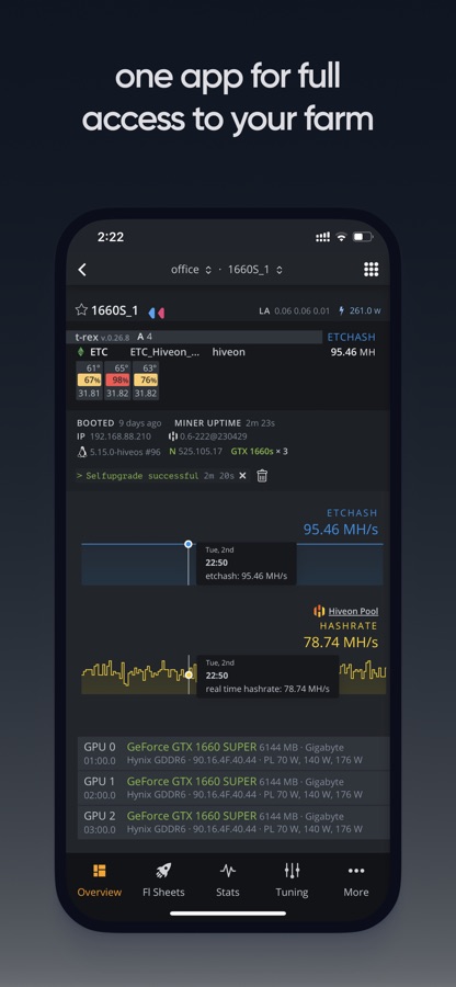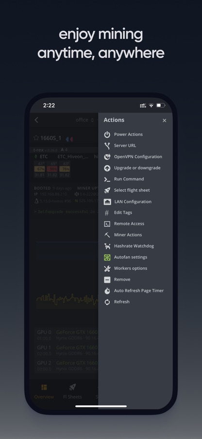 Overclock your mining rigs, change ASICs’ firmware, wallets, coins and flight sheets; check statistics of the whole farm and each individual worker.
