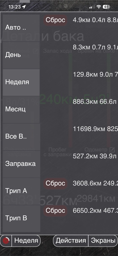 — Расход и все остальные показатели по границам поездки, дня, недели, с момента заправки (*Только в платной версии)