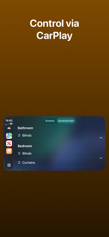 Open doors, turn on lights or set a scene when arriving home with the HomeButtons for CarPlay app. Set accessories & scenes in Settings > CarPlay on your iPhone.
