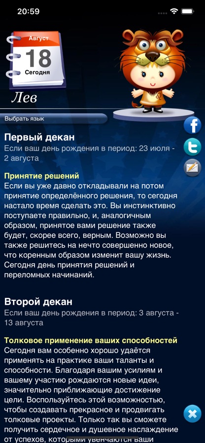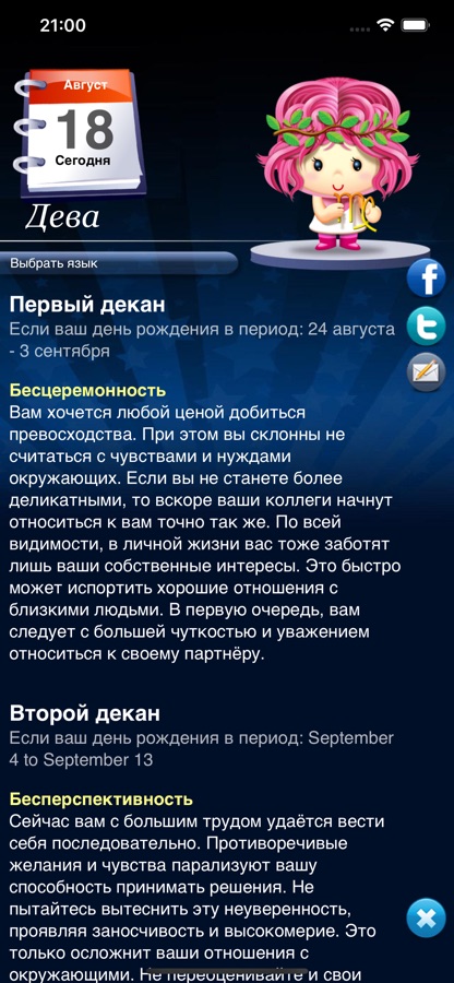 Включает астрологические прогнозы для всех знаков Зодиака, каждый с 3-мя декадами: