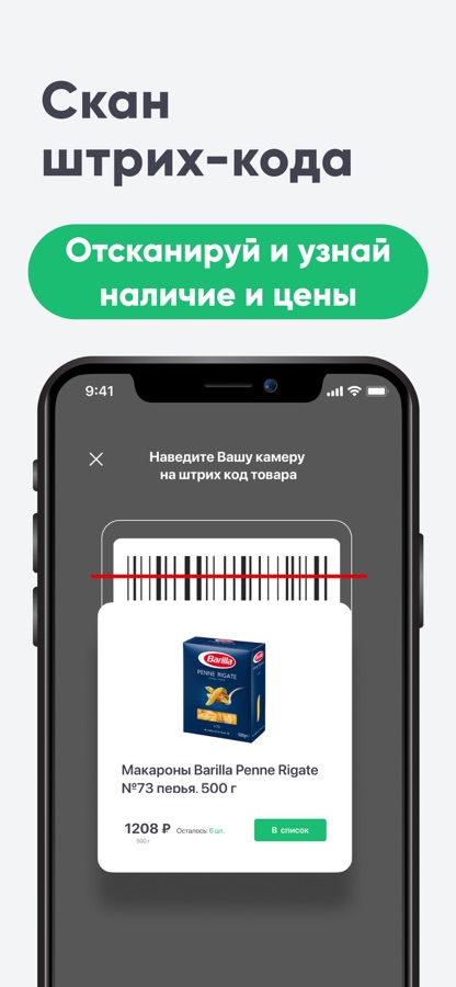 Отсканируйте штрих-код на товаре, чтобы посмотреть его наличие и цену в ближайшем магазине, и есть ли на него выгодная скидка. Ещё один клик – и товар добавлен в список покупок или корзину для заказа продуктов на дом.