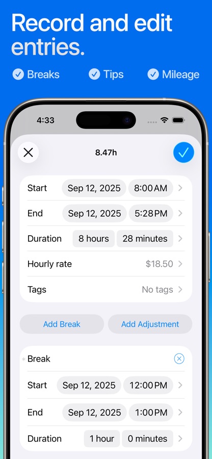 • Track your pay, including Tips, Mileage, and flexible ± time and earnings adjustments