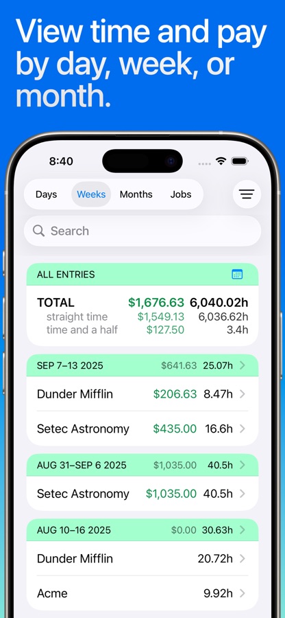 • Built-in reports by Day, Week, and Month and support for most common pay period schedules