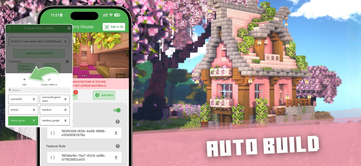— Интуитивно понятные инструменты строительства майнкрафт: структуры, сундук, спавнер мобов и пиксельная графика визуально просматриваются в 3D. Поддержка селектора меню строит дома майнкрафт, автоматически создает дома по выбранному биому и размещает сундуки/сущности по координатам.