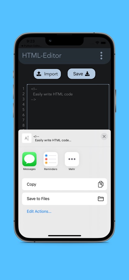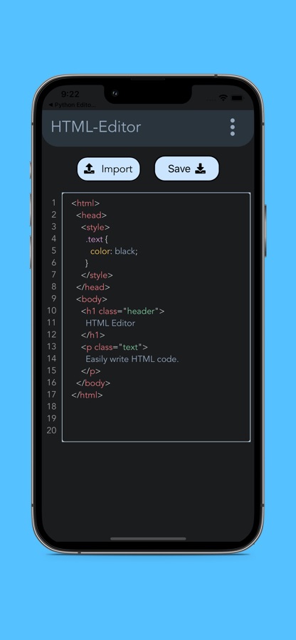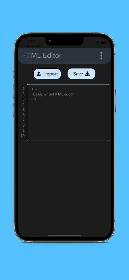 HTML Editor is a simple and powerful app for creating, editing, and saving HTML files on your device. With its intuitive interface and essential features such as import and export and syntax highlighting, HTML Editor is the perfect tool for anyone who needs to manage their HTML code. Whether you’re a student, developer or just need to write or view some code, HTML Editor makes it easy to write HTML code on-the-go or at home. Download HTML Editor now and experience the power of effortless HTML editing!