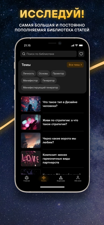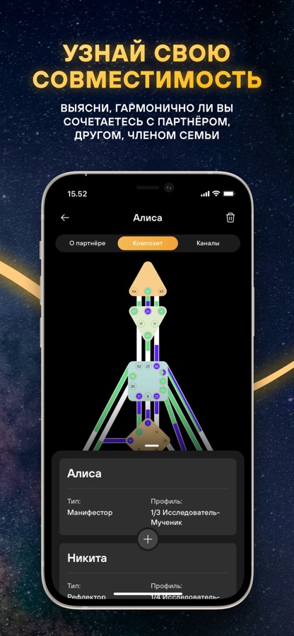 Система Дизайн Человека помогает жить в гармонии с вашей истинной природой. Используя вашу дату рождения, вы получите персонализированный бодиграф и натальные карты. Улучшайте свои отношения, исследуя астрологическую совместимость, и получайте ежедневные аффирмации, чтобы настроиться на правильные энергии.