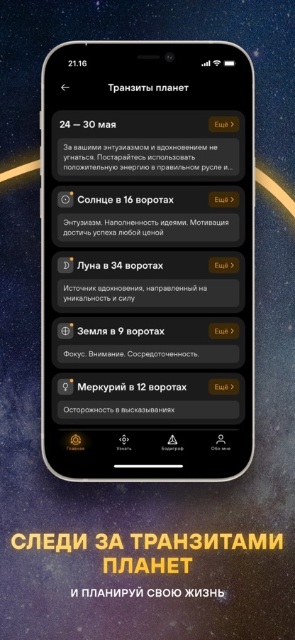 • Узнавать влияние ежедневных планетарных транзитов на вас.