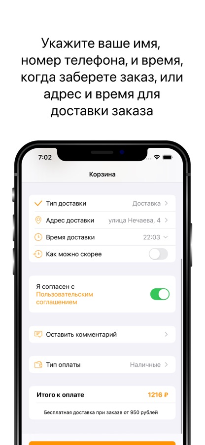 Укажите время, когда хотите прийти за своим заказом или выберите доставку с указанием времени и адреса доставки.