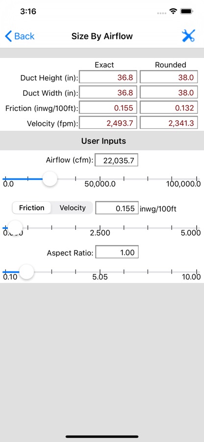 In the «Size by Airflow» mode, you can specify the total airflow in CFM (or L/s), the aspect ratio and one of either the velocity of air or the friction loss per 100 feet (30 meters). The results include both the exact and rounded height and width (or diameter) dimensions and the calculated velocity and friction loss.